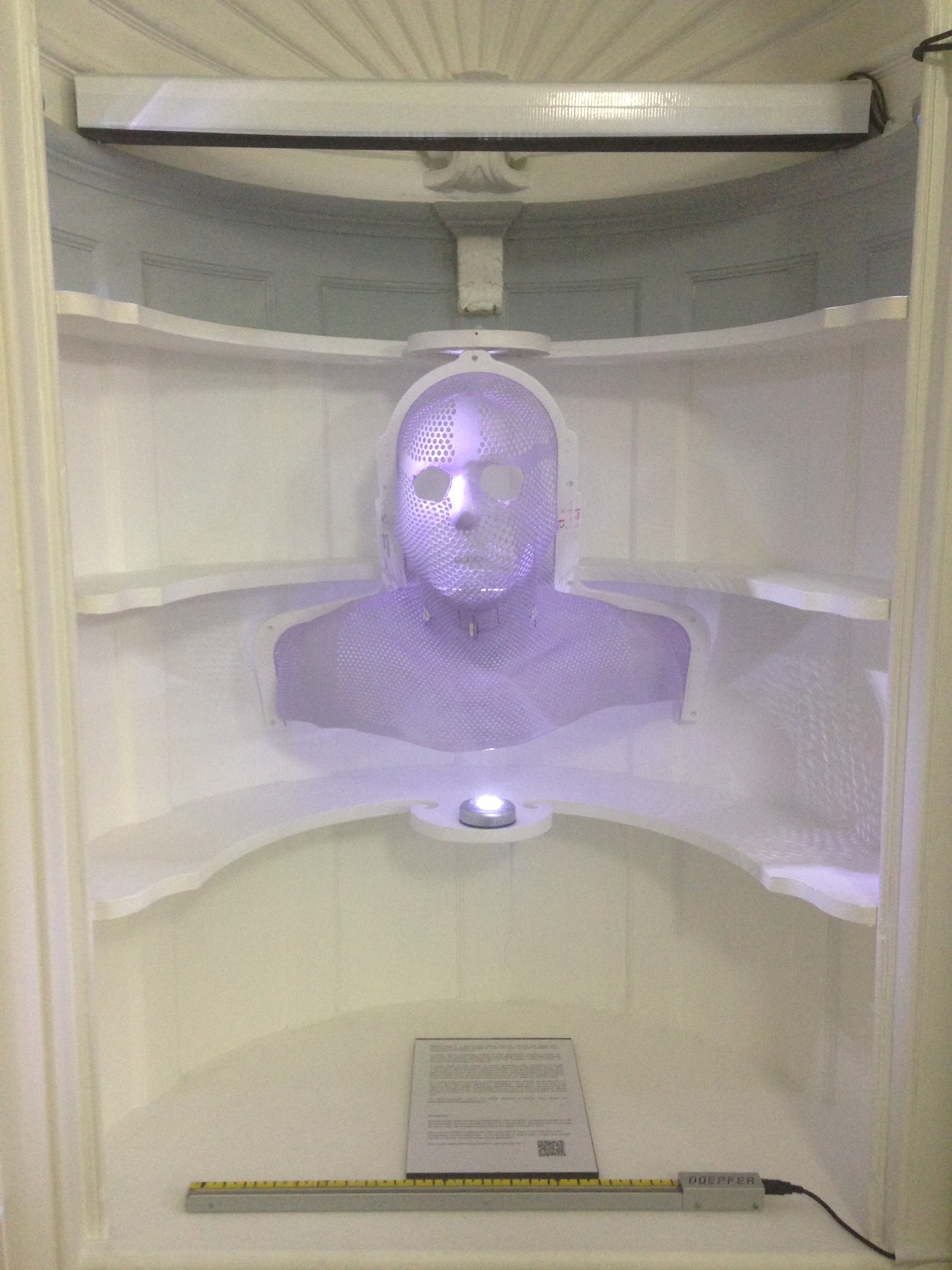 Embrace DNR: Sound Installation presents an illuminated radiotherapy mask. Using audio samples edited from interviews with the mask’s owner, the mask continues to breath… Viewers are encouraged to engage with the piece using a touch sensitive MIDI ribbon controller.